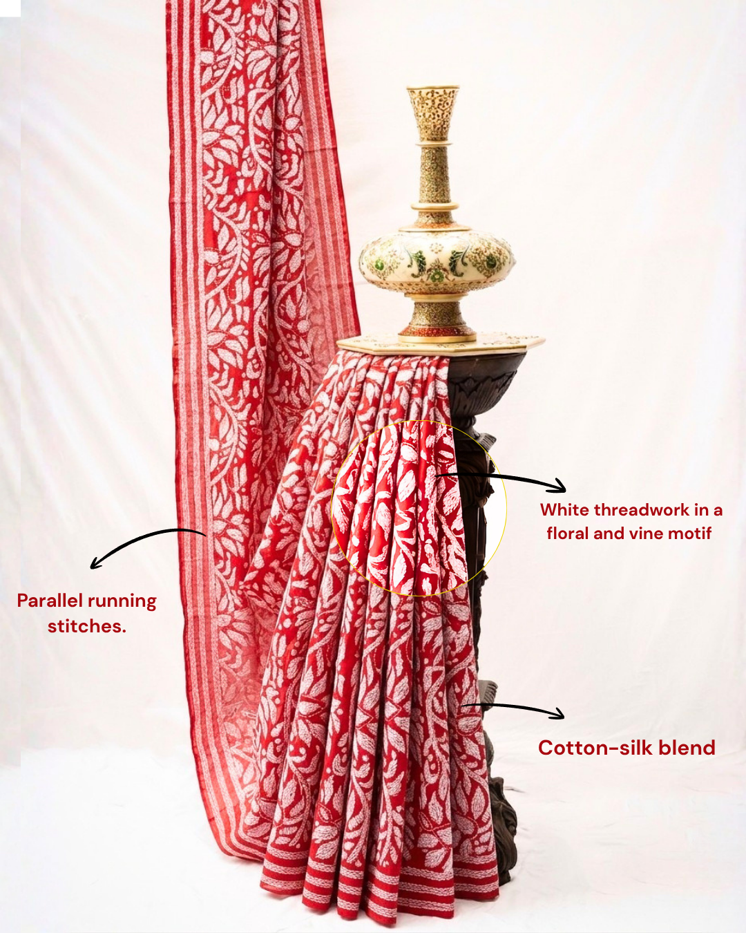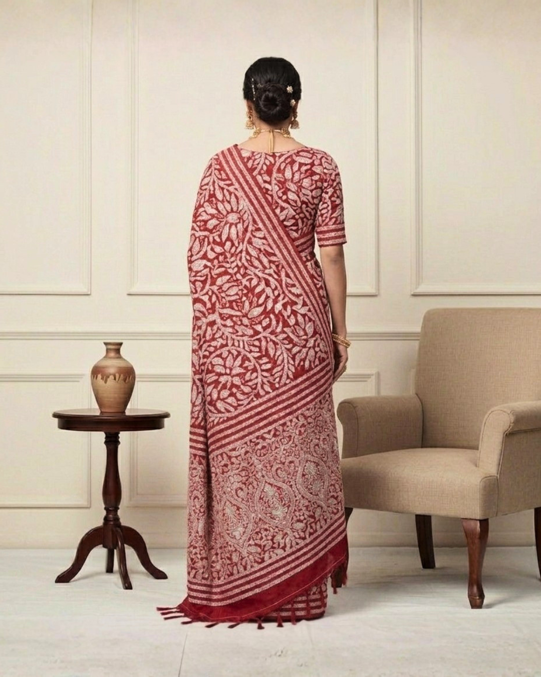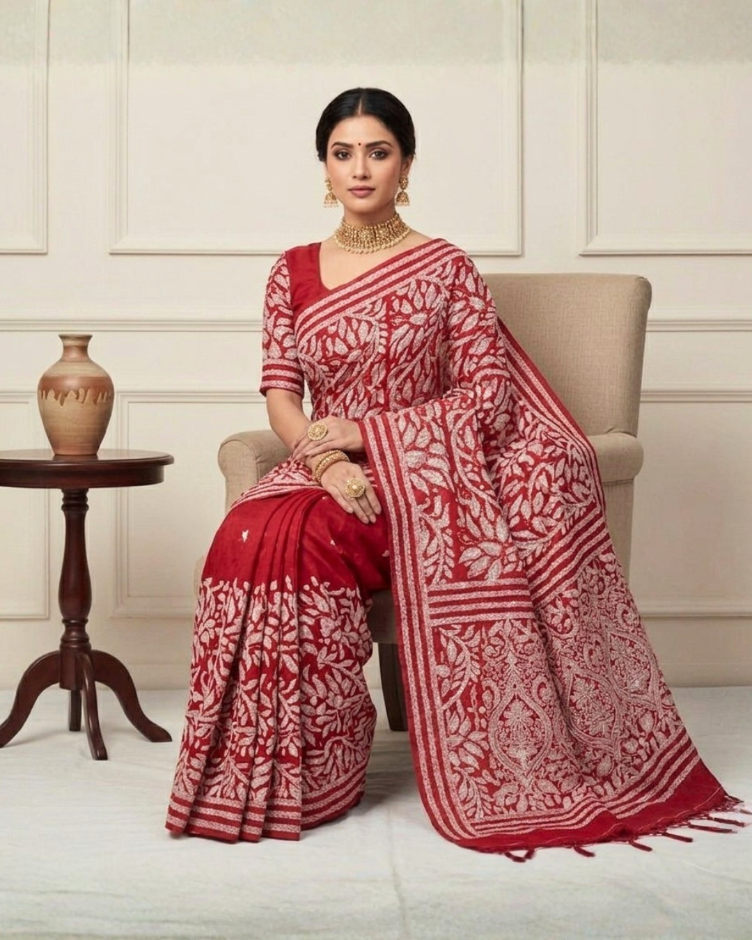 The Semi 3D Kantha Saree is a stunning blend of traditional Kantha embroidery and modern textile aesthetics. Crafted from semi-silk or semi-linen fabric, it features intricate hand-stitched motifs—often floral or nature-inspired—that create a subtle three-dimensional effect on the surface. The embroidery adds texture and depth, enhancing the saree’s visual appeal while maintaining a soft, elegant drape. These sarees are ideal for festive occasions, cultural events, or elegant daywear, offering a graceful fusion of heritage craftsmanship and contemporary style. Each piece reflects the artistry of Bengal’s skilled artisans and is best preserved through dry cleaning.