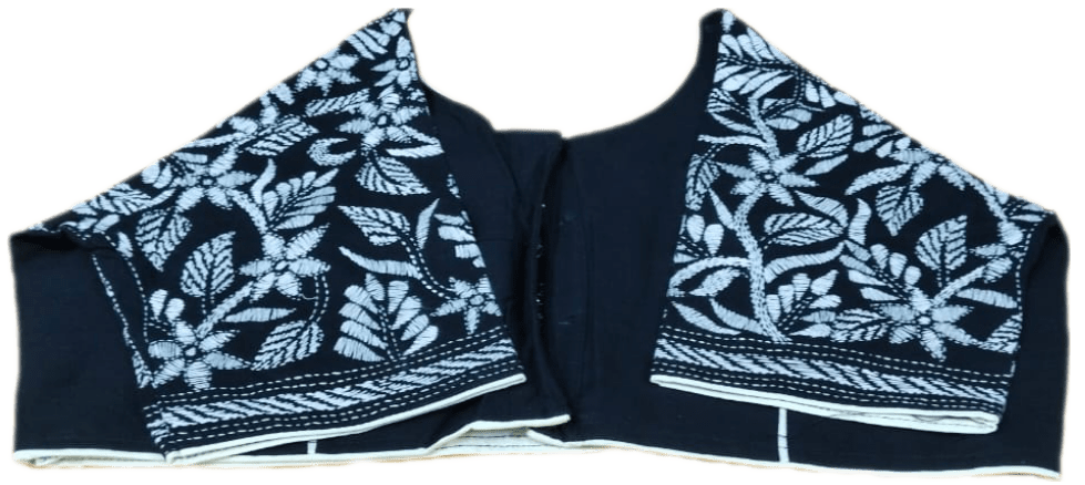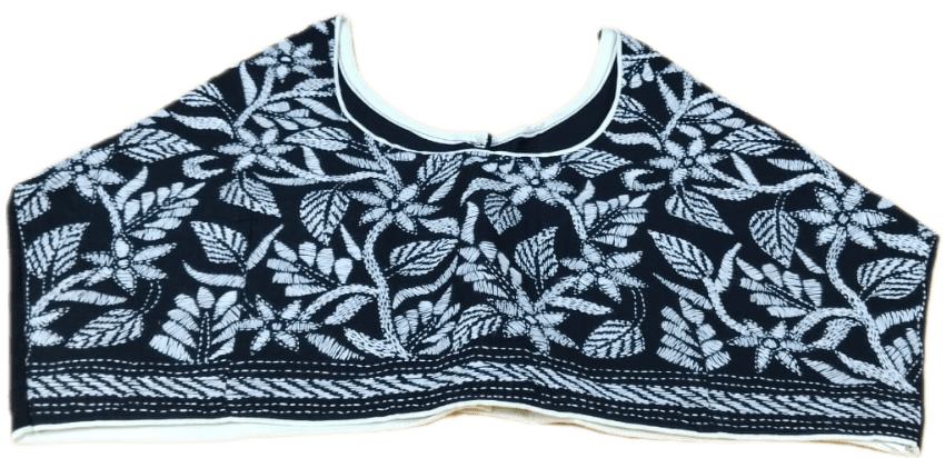Fabric and Color: Crafted from a rich navy blue fabric, likely cotton or silk, this blouse offers both comfort and sophistication. The deep blue serves as a striking backdrop for the intricate white Kantha embroidery.