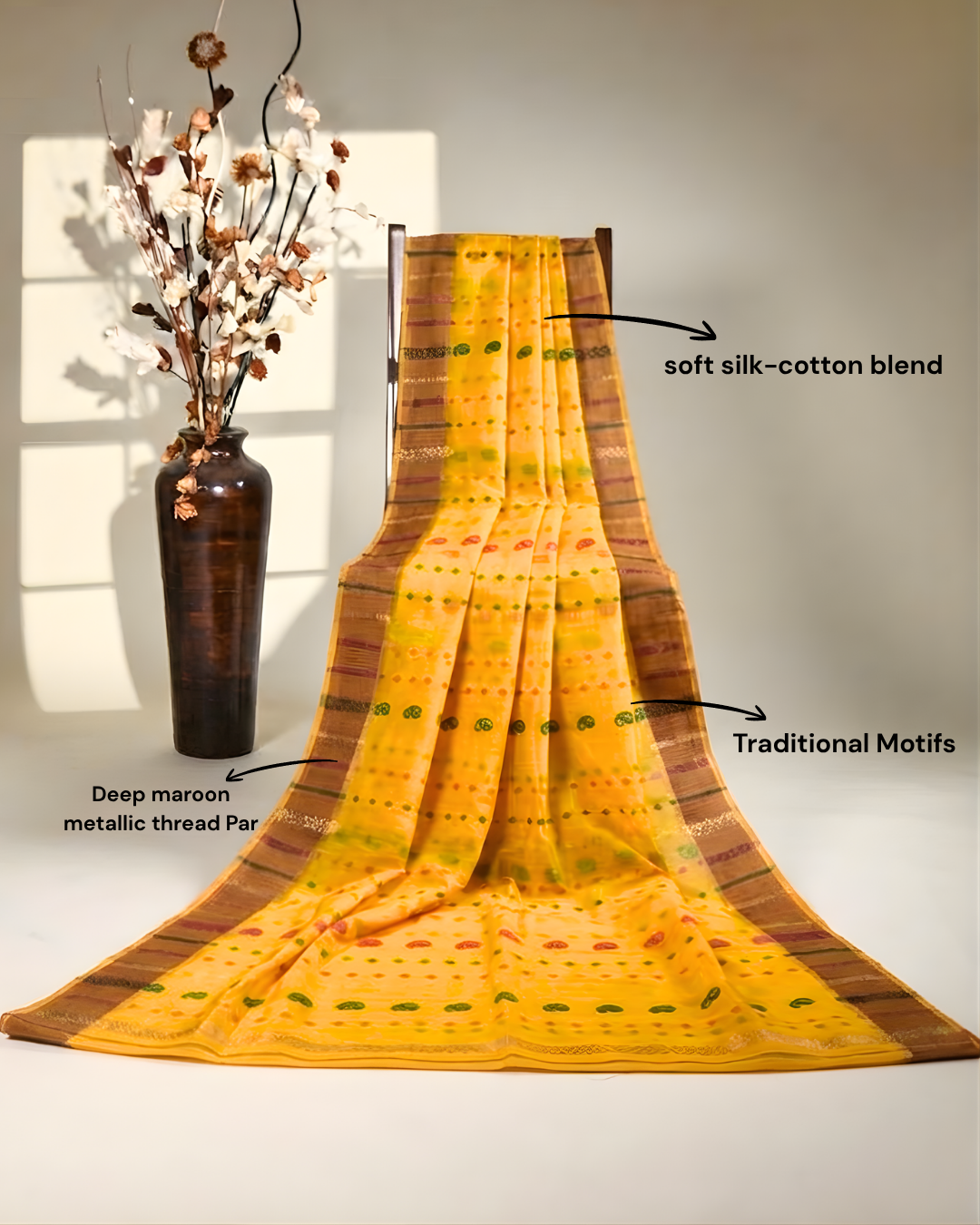 উচ্চমানের সুতি বা সিল্ক দিয়ে তৈরি, এই শাড়িটি অনায়াসে আভিজাত্যপূর্ণভাবে পরার নিশ্চয়তা দেয় এবং আরামদায়ক অভিজ্ঞতা প্রদান করে। মানানসই ব্লাউজের সঙ্গে পরিধান করা হোক বা ঐতিহ্যবাহী গহনার সঙ্গে সাজানো হোক, এটি সময়হীন কারুশিল্প এবং পরিশীলিত সৌন্দর্যের নিদর্শন।