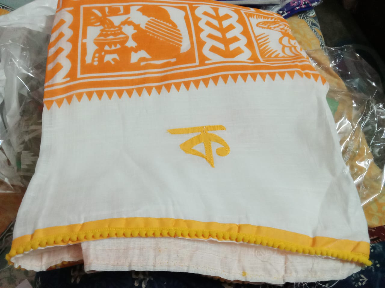 Crafted from soft, breathable cotton or cotton-silk blends, the saree features hand-cut fabric patches—often shaped like Bengali alphabets, birds, or rural scenes—meticulously appliquéd onto the body and pallu. These elements evoke the innocence of early learning and the charm of Santiniketan’s artistic spirit. The base fabric, typically in earthy or pastel tones, provides a serene backdrop for the vibrant appliqué, creating a wearable canvas of culture and creativity.