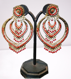 Layered Royal Red Jhumka Earrings A celebration of heritage and artistry, these exquisite jhumka earrings are crafted with layered detailing and bold color. The earrings begin with a circular floral top, leading into concentric teardrop-shaped tiers, each adorned with vibrant red beads and golden metal filigree. The layered design creates a cascading effect, giving the earrings depth, dimension, and dramatic charm.