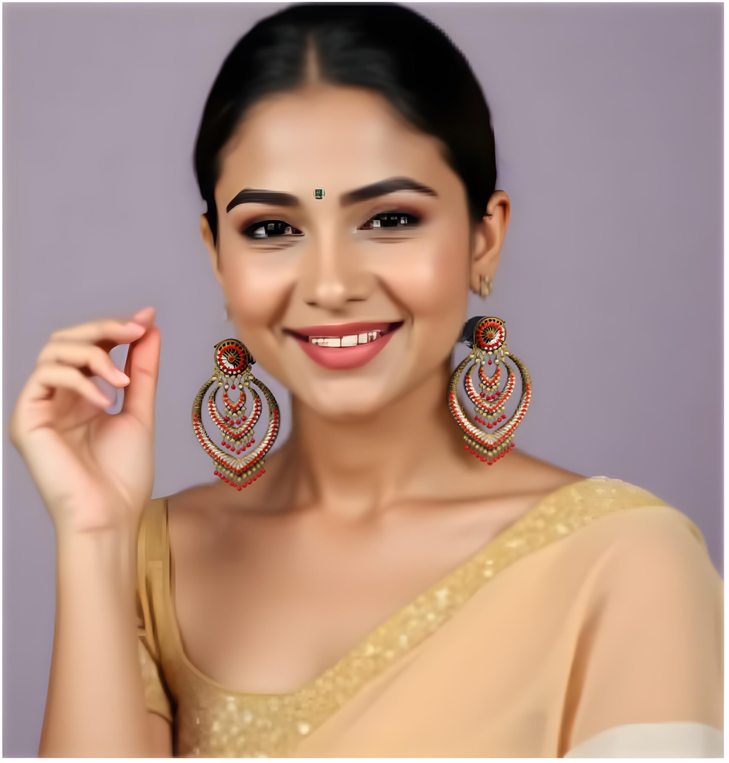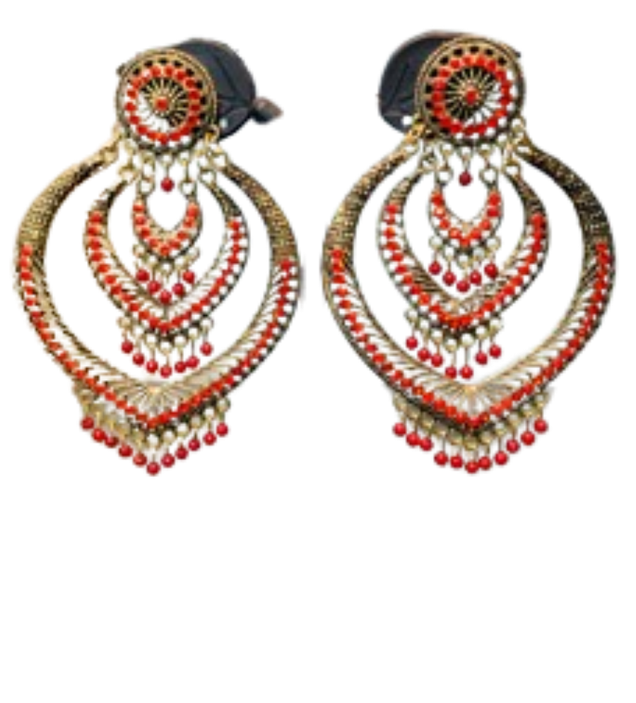 লাল রাজকীয় স্তরভিত্তিক ঝুমকা দুল ঐতিহ্য ও শিল্পকলার এক চমৎকার উদাহরণ এই ঝুমকা দুলজোড়া, যা স্তরিত নকশা ও প্রাণবন্ত রঙে মন কাড়ে। গোলাকার ফুলের নকশা থেকে শুরু করে একাধিক অশ্রু-আকৃতির স্তরে সাজানো হয়েছে উজ্জ্বল লাল পুঁতি এবং সোনালি ধাতুর কারুকাজে। এই স্তরগুলি দুলের মধ্যে গড়ে তোলে এক মোহনীয় গাঁথুনি, যা গভীরতা ও সৌন্দর্য ফুটিয়ে তোলে।