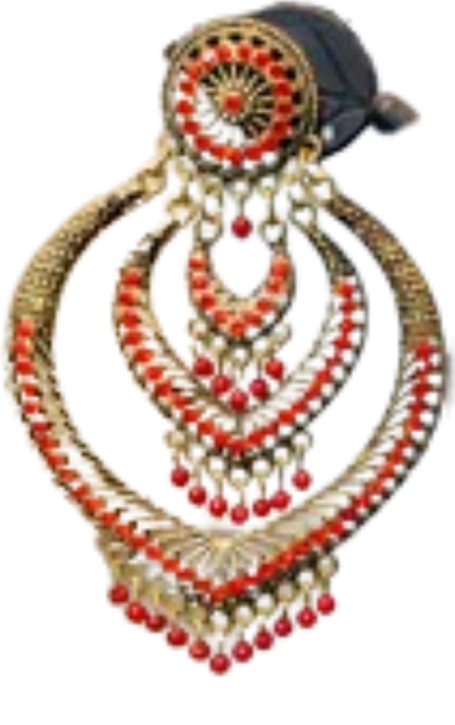 Finished with delicate red tassel beads at the base, these earrings offer eye-catching movement with every step. Ideal for festive wear, weddings, or adding a statement touch to traditional outfits, this piece blends regal elegance with handcrafted flair.
