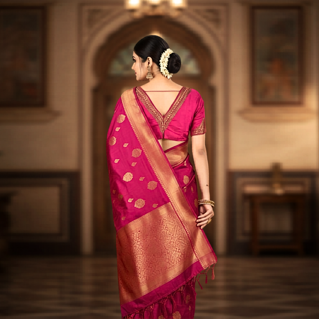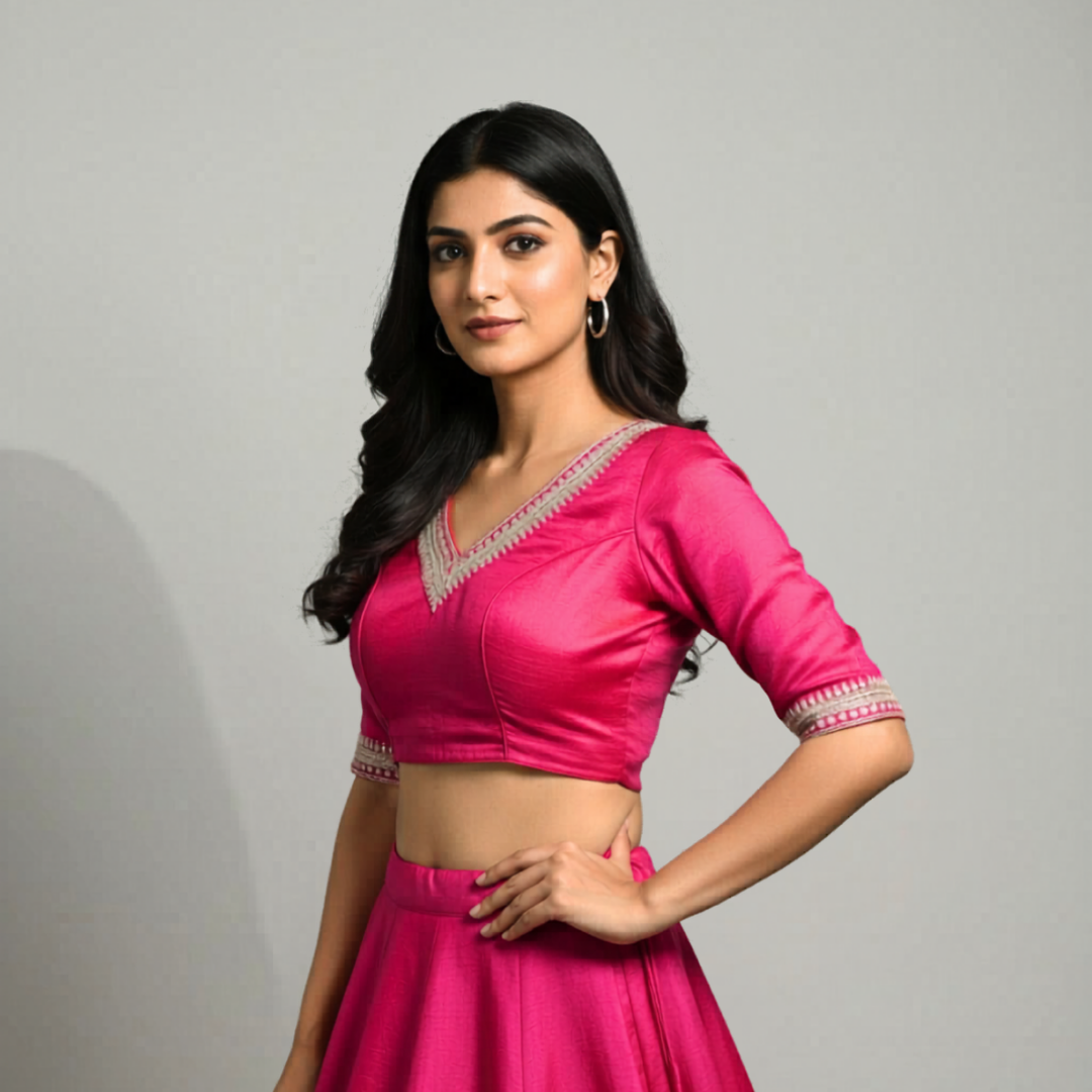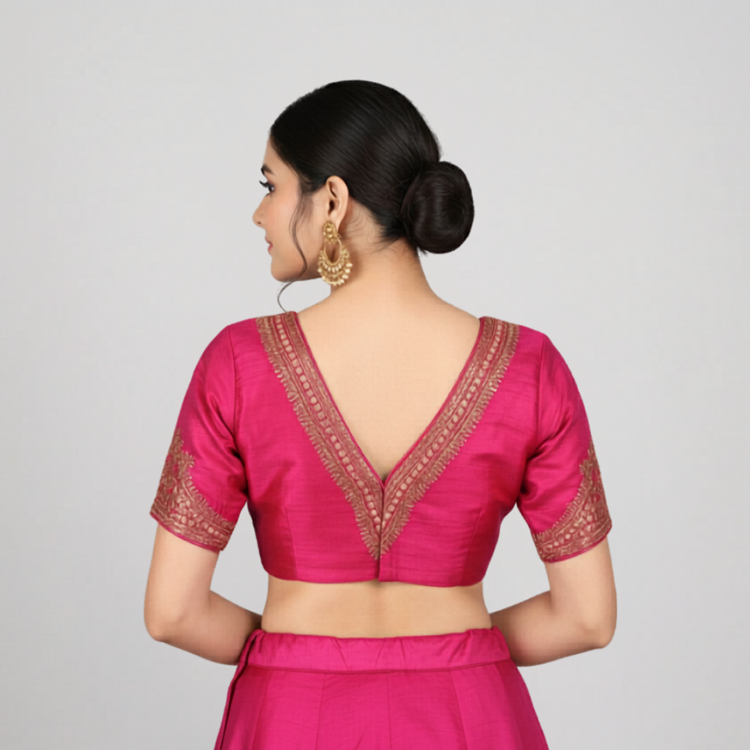 Color and Fabric: The blouse is a vibrant rani pink, crafted from a shiny fabric, likely silk or satin, which adds a luxurious touch.