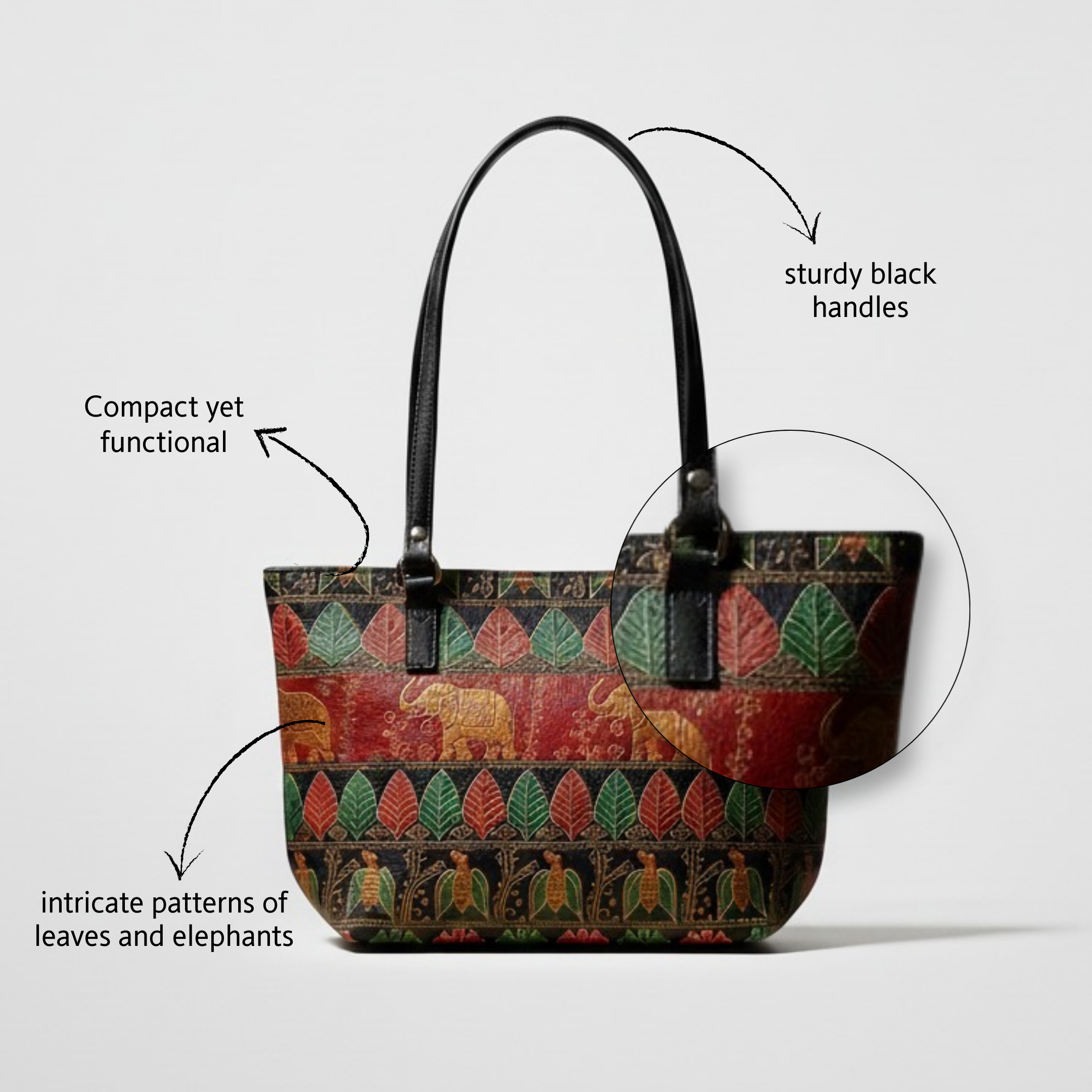 এই সুন্দর হাতের তৈরি ব্যাগটি ঐতিহ্যবাহী শান্তিনিকেতন শিল্পকলার একটি নিদর্শন। এতে লাল, সবুজ এবং কালো রঙের একটি প্রাণবন্ত নকশার সংমিশ্রণ রয়েছে। ব্যাগটির মূল অংশটি সূক্ষ্ম প্যাটার্ন দ্বারা সজ্জিত, যার মধ্যে পাতা এবং হাতির মোটিফ রয়েছে, যা শান্তিনিকেতন চামড়ার কারুশিল্পের আইকনিক উপাদান। ব্যাগটি দুটি দৃঢ় কালো হ্যান্ডল দিয়ে সজ্জিত, যা টেকসই এবং বহনের সহজতা নিশ্চিত করে। উপকরণটি চামড়া এবং কাপড়ের একটি মিশ্রণ বলে মনে হয়, যা শক্তি এবং একটি অনন্য নান্দনিক আবেদন প্রদান করে।